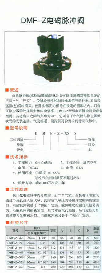 MF-Z-25直角式電磁脈沖閥為直角型閥其進(jìn)出口之間的夾角為90℃,它適用于儲氣筒與除塵噴吹管的安裝連接,氣流暢通,能提供符合要求的清灰氣脈沖。 技術(shù)指標(biāo):工作壓力:0 3-0 6Mpa工作介質(zhì):清潔空氣電壓:Dc24v/Ac220v 電流:800mA/60mA 使用環(huán)境:溫度一10℃~55℃空氣相對溫度不超過85%膜片壽命:100萬次或2~3年 DMF-Z電磁脈沖閥型號規(guī)格表 型號 口徑 接口直徑 工作 電壓 工作 壓力連接螺紋 公制 DMF-Z-20 3/4〞 G3/4〞 20 DC24V AC220V 0.2-0.6Mpa DMF-Z-25 1〞 G1〞 25 DMF-Z-40 11/2〞 G11/2〞 40 DMF-Z-40S 11/2〞 G11/2〞 40 DMF-Z-50S 2〞 G2〞 50 DMF-Z-62S 21/2〞 G21/2〞 62 DMF-Z-76S 3〞 G3〞 76 DMF-Z型電磁脈沖閥各種規(guī)格外形尺寸表 (mm) 型號 寬度 A B C D DMF-Z-20 80 88 128 48 20 DMF-Z-25 96 108 136 60 23 DMF-Z-40 112 131 148 75 32 DMF-Z-40S 112 131 180 75 32 DMF-Z-50S 160 180 206 100 43 DMF-Z-62S 188 204 226 110 49 DMF-Z-76S 200 220 250 120 66