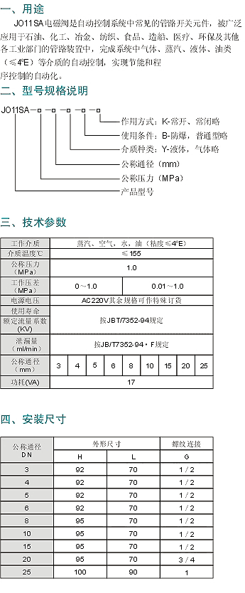 JO11SA系列電磁閥適用于空氣、水、油(運動粘度小于28.4×10-6m2/s)、蒸汽、酸性或堿性介質(zhì)的管道系統(tǒng),它受控制裝置發(fā)出的電信號工作,通電關(guān)、斷電開。 JO11SA系列電磁閥是以電磁鐵為動力,假助管道壓力實行開關(guān)的先導(dǎo)式結(jié)構(gòu)閥門。
